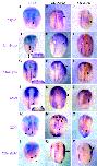 Fig. 1. Expression and protein sequence of XGadd45-γ. (A) Vegetal view; (BâF,I) dorsal views; (G) ventral view; (H,J,K) lateral views. (A) XGadd45-γ is expressed in the dorsal mesoderm (arrowhead) at early gastrula stages (stg). Throughout gastrulation, XGadd45-γ is also expressed in scattered cells of the animal region (not shown). (B) At mid-late gastrula, three rows of cells at each side of the midline start to accumulate XGadd45-γ mRNA (arrowheads). (C) These rows of XGadd45-γ expressing cells are clearly visible in the early neurula (black arrowheads). XGadd45-γ is also expressed in forming somites (arrows) (Jen et al., 1999) and in a horseshoe-shaped domain within the anterior neural plate (white arrowhead). This pattern is similar to that of XDl1 (inset). (D) A similar expression profile is observed at mid neurula stages. (D, inset) Transverse section of a mid neurula revealing XGadd45-γ expression in three neuroectodermal rows of cells (black arrowheads), in the notocord (white arrowhead) and in somites (arrow). (E) Mid neurula doubly hybridized for XGadd45-γ and N-tubulin and shown after the first chromogenic reaction to detect XGadd45-γ mRNA (cian). (F) After second chromogenic reaction to detect N-tubulin (purple). Insets in (E) and (F): high magnifications views of the lateral neural stripe pointed at with an arrowhead in their corresponding panels. During neurula stages, XGadd45-γ is also expressed in the prospective cement gland (G, arrowhead), trigeminal placode (H, arrowhead) and in scattered cells in the non-neural ectoderm (H, arrow). XGadd45-γ expression is detected in the same sites at later stages (I). In late neurula (J) and tailbud stages (K), XGadd45-γ is expressed in territories in which secondary neurogenesis takes place, such as the eye (arrows) and brain (arrowheads). (LâM) Hindbrain transverse sections of tailbud embryos showing XGadd45-γ (L) and XDl1 (M) domains of expression (arrowheads). (N) Amino acid sequence alignment of Xenopus and human Gadd45-γ proteins (accession numbers AJ414384 and AF078078, respectively). Identical residues are indicated by dashes. |