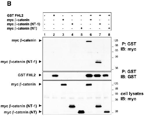 Figure 3. The NH2 terminus of β-catenin is sufficient for binding to FHL2. (A) Yeast Y190 cells were cotransformed with GAL4-DNAâbinding domain (FHL2) and GAL4âactivation domain (β-catenin) chimeric constructs, and proteinâprotein interactions were evaluated by a β-Gal filter assay. The numbers over the diagrams indicate β-catenin amino acids encoded by each construct. The arrangement of armadillo repeats is based on Hulsken et al. (1994). (B) HEK 293 cells were transiently transfected with cDNA constructs as indicated and lysed with RIPA buffer. The presence of myc-tagged β-catenin and its deletion mutants in GSTâFHL2 precipitates (P) were detected by immunoblotting (IB) with myc antibody (top blot). To ascertain the amount of precipitated FHL2 protein, the blot was redeveloped with antibodies against GST. The blot on the bottom shows the expression in transfected cells of full-length mycβ-catenin and deletion mutants; β-catenin (NT-1) with the NH2 terminus plus the first armadillo repeat, and β-catenin (NT) with the NH2 terminus only. 10 μg of total cell lysates were loaded.