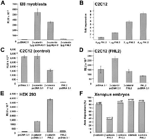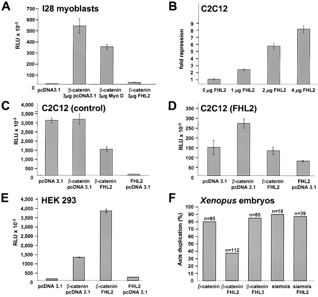 Figure 6. FHL2 influences β-cateninâmediated activation of TCF/LEF-dependent transcription. (A) TOPflash luciferase reporter plasmid was cotransfected with β-catenin S33A and the indicated amounts of FHL2 or MyoD (as a control) cDNAs into I28 mouse myoblast cells. Luciferase activity is given in relative light units (RLU). Basal activity of the TOPflash promoter was measured in the presence of empty expression vector to maintain equivalent amounts of transfected DNA. Results shown are the average of three independent transfections. (B) C2C12 cells were cotransfected with constant amounts of TOPflash plasmid and β-catenin S33A, and with increasing amounts of FHL2 plasmid as indicated. Values indicate fold repression of the β-cateninâinduced reporter gene activity. The induction of reporter gene activity by β-catenin alone was arbitrarily taken as unity. (CâE) C2C12 cells stably infected with pBabe vector alone (C), or pBabe myc-FHL2 vector (D), or HEK 293 cells (E) were transfected with TOPflash luciferase reporter plasmid and the indicated expression plasmids. (F) Xenopus embryos were injected with different RNAs as indicated at the four-cell stage. Bars represent the percentage of embryos with duplicated axis at stage 19â23. n, No. of embryos examined.