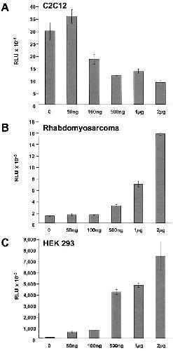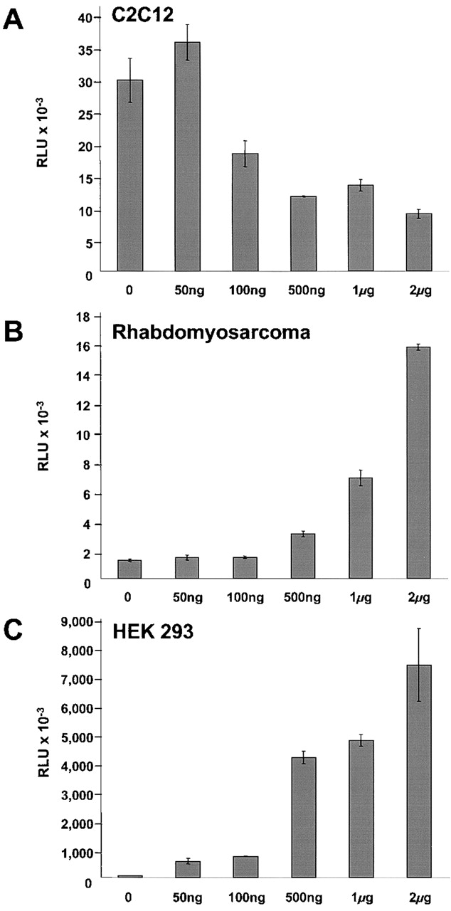 Figure 7. FHL2 exhibits an autonomous repression function restricted to fusion-competent myoblasts. Increasing amounts of GAL-FHL2 plasmid and 1μg 5xUAS tk-luc reporter plasmid were cotransfected as indicated into C2C12 (A), Rhabdomyosarcoma (B), or HEK 293 cells (C).
