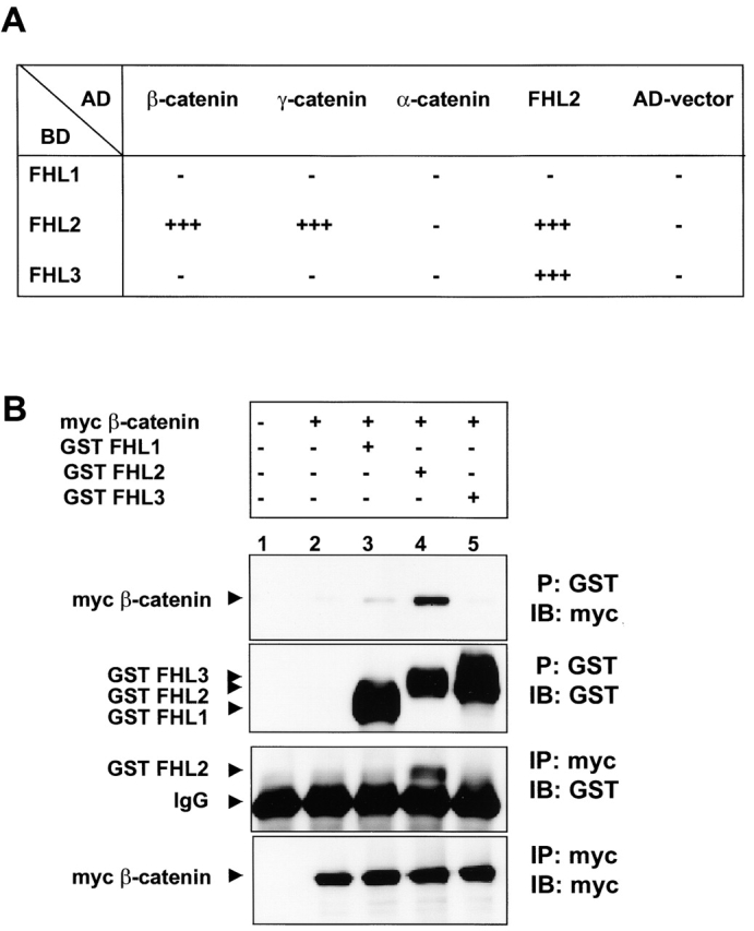Figure 2. Specificity of interaction of FHL proteins with α-catenin, β-catenin, and γ-catenin. (A) Yeast Y190 cells were cotransformed with GAL4-DNAâbinding domain (BD) and GAL4âactivation domain (AD) chimeric constructs. The interaction was evaluated using a β-Gal filter assay as described in Materials and methods. The interactions of FHL proteins with AD-FHL2 or the empty AD-vector represent positive or negative controls. (B) HEK 293 cells were transiently transfected with cDNA constructs as indicated. After 34 h, RIPA cell lysates were divided into two parts and proteins were either precipitated (P) with glutathione-conjugated Sepharose beads for GST-tagged proteins or immunoprecipitated (IP) with the antibody 9E10 for myc-tagged proteins. The coprecipitated proteins were analyzed in immunoblots (IB) with appropriate antibodies. After the first immunodetection, the blots were stripped and redeveloped with antibodies against GST- or myc-tag to ascertain the amount of precipitated proteins.