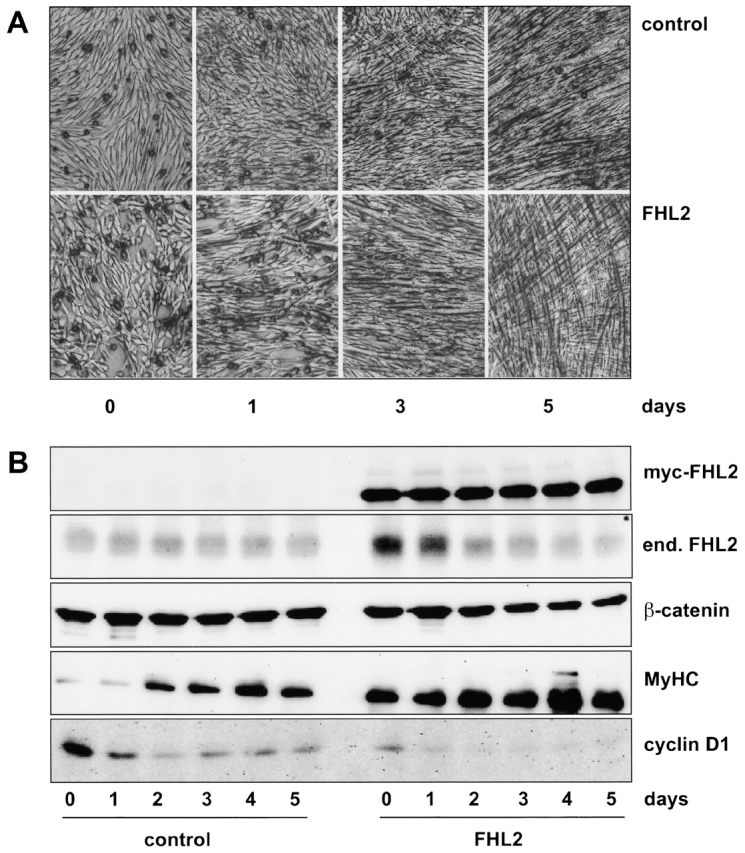 Figure 9. Ectopic expression of FHL2 promotes differentiation of C2C12 myoblasts. (A) C2C12 myoblasts infected with retroviruses containing the pBabe vector alone (control) or pBabe with myc-FHL2 (FHL2) were cultured in growth medium until 90–95% confluency (day 0) and then shifted to differentiation medium (days 1–5). (B) Lysates (20 μg protein/lane) from cells cultured in growth medium (day 0) or in differentiation medium (days 1–5) were immunoblotted with anti-myc mAb 9E10, anti-FHL2 mAb, anti–β-catenin mAb 14, anti-MyHC mAb NOQ7.5.4D, or anti–cyclin D1 mAb DCS-6.