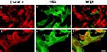 Figure 5. Subcellular localization of FHL2 and β-catenin. C2C12 cells cultured on coverslips were transiently transfected with EGFPâFHL2. Cells immunostained with anti-βâcatenin mAb and Alexa-conjugated goat antiâmouse polyclonal antibody were analyzed by fluorescence microscopy. Although β-catenin (red) is concentrated at the membrane and at cellâcell contacts, EGFPâFHL2 (green) is concentrated at focal adhesion sites. The merged images show no colocalization of the two proteins at membrane level. Panels aâc and dâ f represent pictures taken with 40à or 63à objectives, respectively. Bars, â¼10 μm.