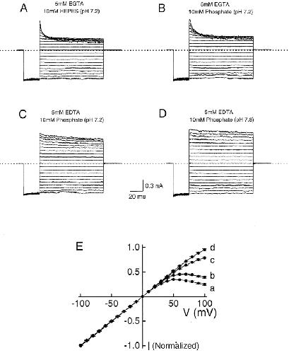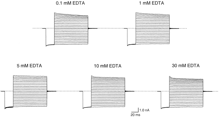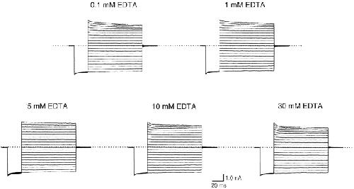 Figure 5. . Effects of EDTA concentration on IRK1 currents. All traces were recorded from the same patch, with intracellular EDTA concentrations as indicated. The corresponding I-V curves are shown in Fig. 6. Solution pH was buffered with phosphate. |