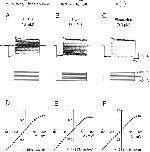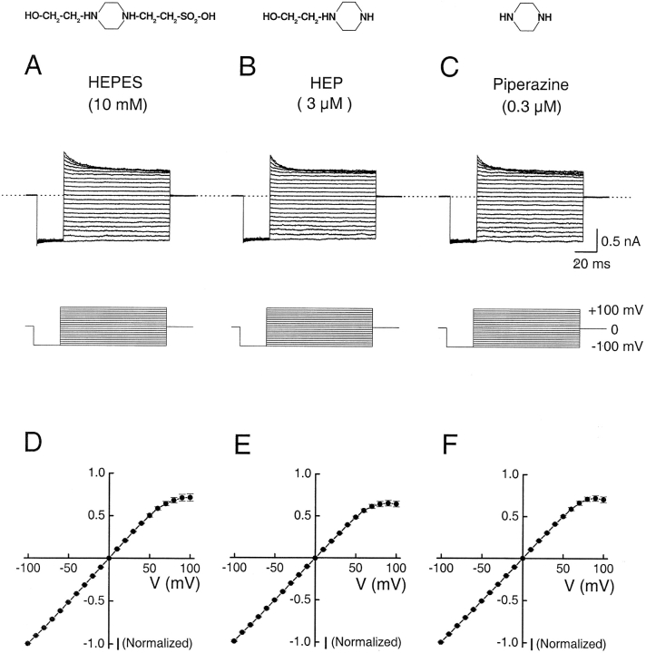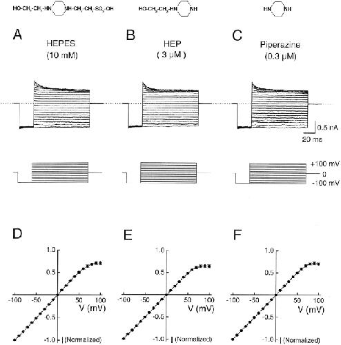 Figure 1. . Comparisons of the effects of intracellular HEPES, HEP, and piperazine on IRK1 currents (structures shown at top). (A–C) Currents were recorded with 10 mM HEPES, 3 μM HEP and 0.3 μM piperazine, respectively, from the same inside-out patch with the voltage pulse protocol shown below. In all cases the intracellular solutions contained 100 mM K+, 5 mM EDTA, and 10 mM phosphate (pH 7.6) besides the tested chemicals, whereas the extracellular solution contained 100 mM K+, 0.3 mM Ca2+, 1 mM Mg2+, 10 mM phosphate (pH 7.6). The currents are corrected for background current. Dotted lines identify the zero current level. (D–F) Normalized I-V curves, corresponding to A–C, which were constructed from the currents determined at the end of each test voltage-pulse. Current at each voltage is normalized (except for its signs) to that at −100 mV. Each data point represents the mean (± SEM) of currents recorded from 5–7 patches. |
