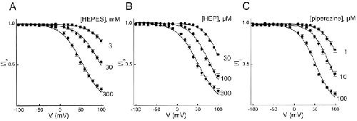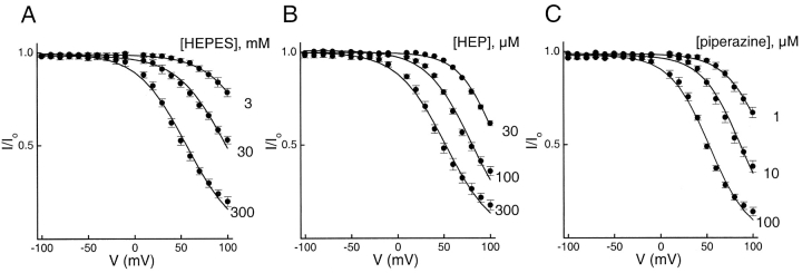 Figure 2. . HEPES, HEP, and piperazine concentration dependence of channel block. The fraction of unblocked currents in the presence of three representative concentrations of HEPES (A), HEP (B), or piperazine (C) is plotted against membrane voltage. The theoretical curves are fits of the Woodhull equation, which give Kd(0 mV) = 2.47 ± 0.02 M (mean ± SEM, n = 6) and Z = 1.02 ± 0.02 for HEPES, Kd(0 mV) = 2.97 ± 0.16 mM (n = 6) and Z = 1.09 ± 0.03 for HEP, and Kd(0 mV) = 0.27 ± 0.04 mM (n = 8) and Z = 1.08 ± 0.02 for piperazine. |