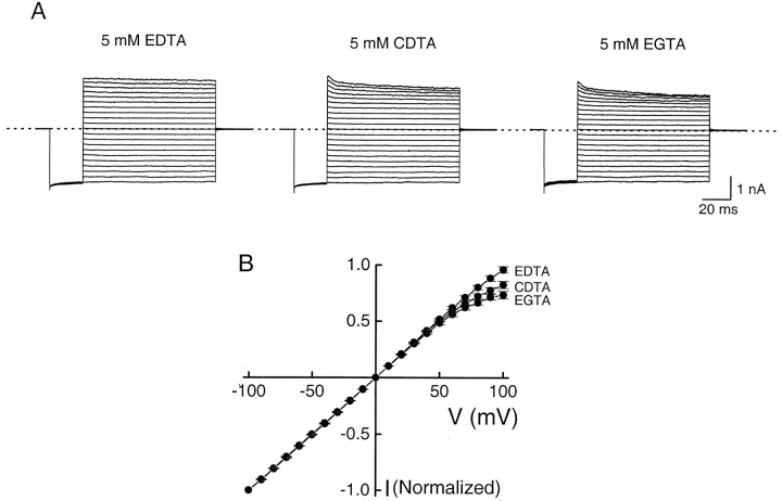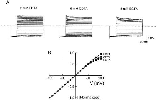 Figure 4. . IRK1 currents in the presence of three metal ion chelators. (A) Current records collected from the same patch in the presence of intracellular EDTA, EGTA, or CDTA, each at 5 mM. Phosphate was used to buffer pH. (B) Normalized I-V curves in the presence of the metal ion chelators. All data points are mean ± SEM (n = 5). |