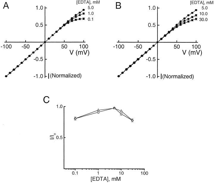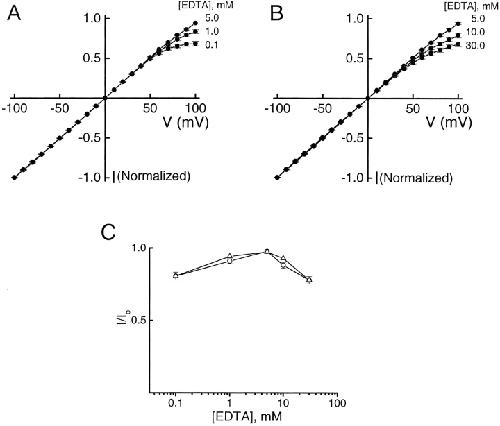Figure 6. . Effects of EDTA concentration on the I-V curves of IRK1 channels. Normalized I-V curves in the presence of various concentrations of EDTA. For clarity, I-V curves with 0.1–5 mM intracellular EDTA (A) are plotted separately from those with 5–30 mM EDTA (B). All data points are mean ± SEM (n = 4–6). (C) Normalized current at 80 mV, taken from the I-V curves in A and B, is plotted against the concentration of EDTA. The data represented by the circles (mean ± SEM) were determined experimentally, whereas those by triangles were calculated using Eq. 1, as described in discussion. |