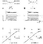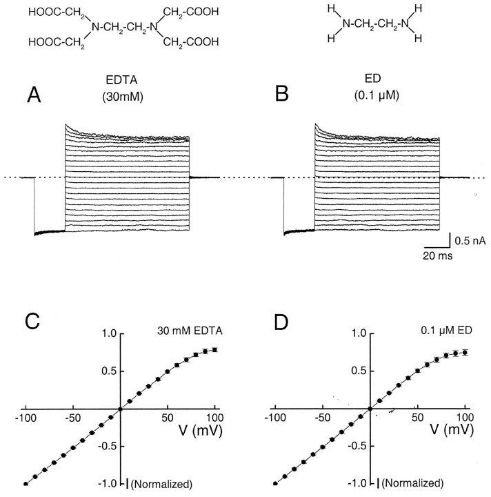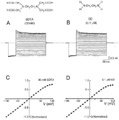 Figure 8. . Comparisons of the effects on IRK1 currents of intracellular EDTA and ethylenediamine (structures shown at top). (A and B) Currents were recorded from the same membrane patch with, respectively, 30 mM EDTA and 0.1 μM ethylenediamine. (C and D) Normalized I-V curves; each data point represents the mean (± SEM; n = 5) of currents. |