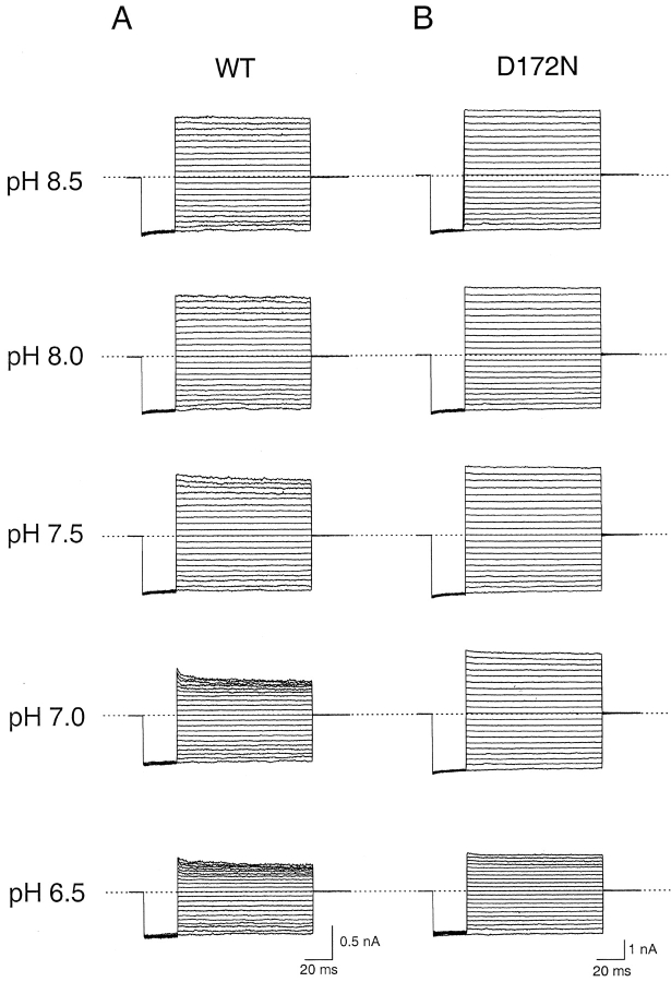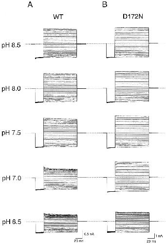 Figure 9. . Effects of intracellular pH on the currents of wild-type and D172N mutant IRK1 channels. Currents were recorded at various intracellular pH, with extracellular pH = 7.6 throughout. For each channel type, all currents were obtained from the same inside-out patch. |