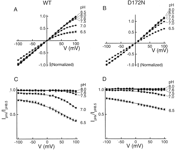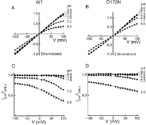 Figure 10. . Effects of intracellular pH on the I-V curves of wild-type and mutant IRK1 channels. (A and B) I-V curves of wild-type and D172N mutant IRK1 channels at various intracellular pH, determined from the current records, as shown (and including those) in Fig. 9, except for those at pH 7.6, which were taken from those as shown in Fig. 4 A. (C and D) Currents through IRK1 and D172N channels, normalized to those at pH 8.5, are plotted against membrane voltage. All data points are mean ± SEM (n = 5). |