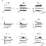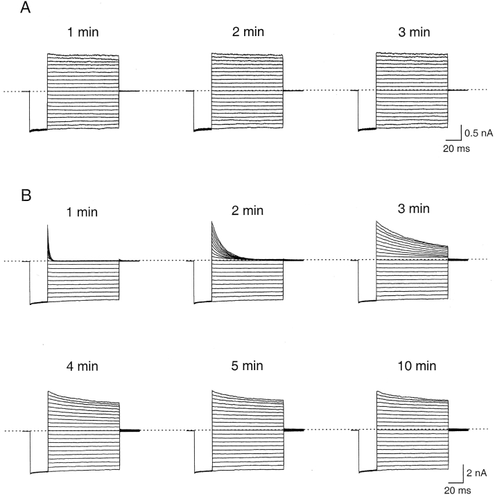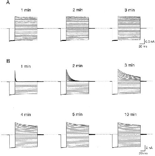 Figure 11. . Variable degree and rate of removal of endogenous blockers by perfusion. Current traces shown in A and B were recorded from two separate patches excised from two oocytes injected with different amounts of cRNA (higher in A than in B). The recordings were made at the indicated times following the start of perfusion. |