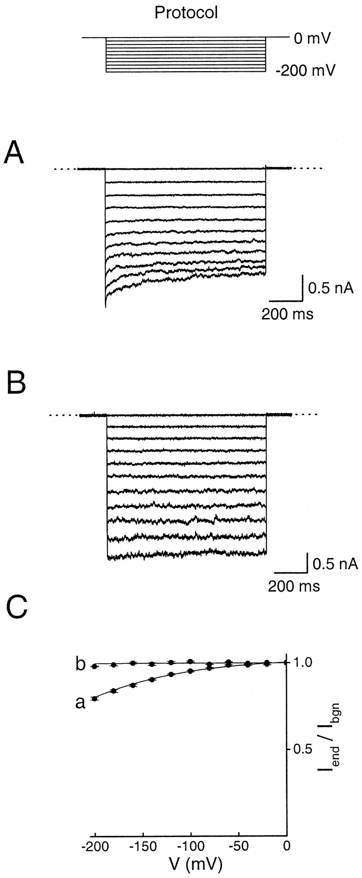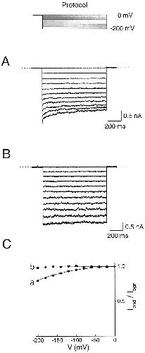 Figure 12. . Relaxation of inward currents caused by extracellular divalent cations. Currents were recorded with the voltage protocol shown at the top. Intra- and extracellular solutions were buffered with 10 mM phosphate. The extracellular solution contained 0.3 mM Ca2+ and 1 mM Mg2+ in A, but 5 mM EDTA and no added Ca2+ or Mg2+ in B. (C) The ratio of currents at the end and the beginning of voltage pulses (Iend/Ibgn) is plotted against membrane voltage. The data corresponding to A and B are labeled by letters a and b, respectively. All data points are mean ± SEM (n = 5). |