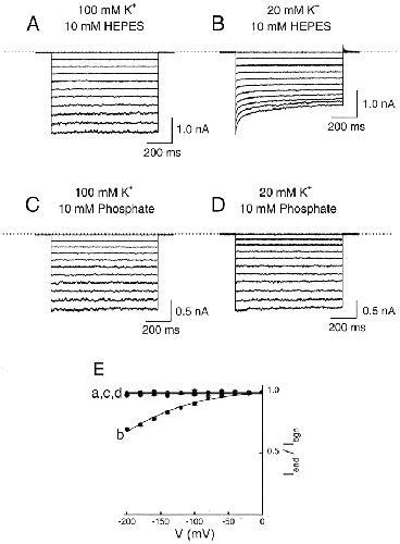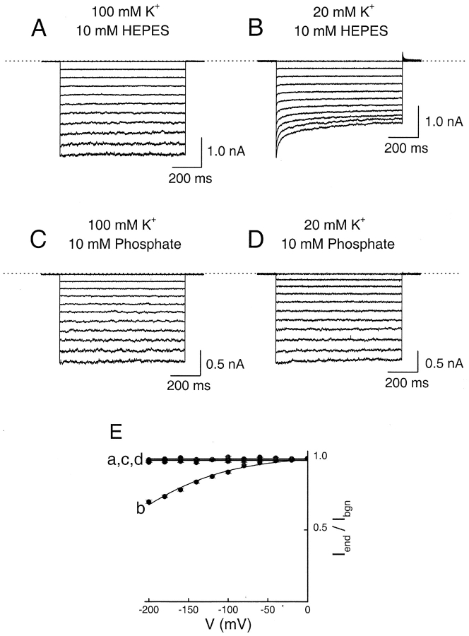 Figure 13. . K+ dependence of the inward current relaxation in the presence of extracellular HEPES. All currents were elicited with the voltage protocol shown in Fig. 12, with 5 mM EDTA and no added divalent cations present in the extracellular solution. Extracellular solutions were buffered with 10 mM HEPES (A and B) or phosphate (C and D), and contained either 100 mM K+ (A and C) or 20 mM K+ (B and D). (E) The ratio of currents at the end and the beginning of voltage pulses (Iend/Ibgn) is plotted against membrane voltage. The data corresponding to A–D are labeled a–d, respectively. All data points are mean ± SEM (n = 5). |