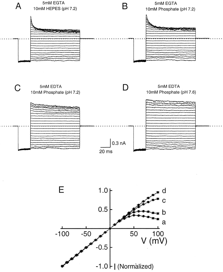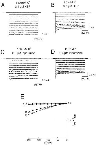 Figure 14. . K+ dependence of inward current relaxation in the presence of extracellular HEP or piperazine. Intra- and extracellular solutions were buffered with 10 mM phosphate. The extracellular solution contained 3 μM HEP (A and B) or 0.3 μM piperazine (C and D), and either 100 mM K+ (A and C) or 20 mM K+ (B and D). (E) The ratio of currents at the end and the beginning of voltage pulses (Iend/Ibgn) is plotted against membrane voltage. The data corresponding to A–D are labeled a–d, respectively. All data points are mean ± SEM (n = 5). |