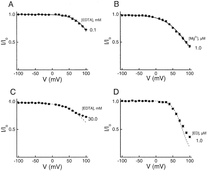 Figure 7. . Comparisons of channel block by “EDTA” with block by Mg2+ or ethylenediamine. (A and C) Currents with 0.1 mM and 30 mM EDTA normalized to that with 5 mM EDTA are plotted against membrane voltage, respectively. (B and D) The fraction of unblocked currents in the presence of Mg2+ or ethylenediamine (ED), respectively, is plotted against membrane voltage. All data points are mean ± SEM (n = 5). All curves are fits of the equation I/Io = 1/(1 + [blocker]/Kd), where Kd = Kd(0 mV)e−ZFV/RT. For A and B, the two nearly superimposed curves for each data set are fits either all data points (continuous curves) or all but the rightmost three data points (dashed curves). For C or D, the dashed curve through each dataset is a fit to all but the rightmost three data points. |