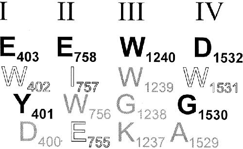Figure 1. . Sites of informative cysteine substitution mutations in the outer pore. The SS2 segments are shown schematically in order of relative position from the DEKA Na ion selectivity region. Residues lettered in black represent sites at which cysteine substitution yielded informative data in state-dependent accessibility assays described below. Sites lettered in black outline denote locations at which we were not able to measure a modification rate of substituted cysteine residues. Residues in light gray were not tested, either because they were uninformative since they had no measurable effect when exposed to MTS-ET (D400, W756, K1237, and A1529), they did not produce a detectable INa (G1238), or the predicted modification rate was too slow for our assay (W1239).