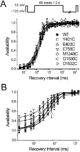 Figure 2. . Introduction of cysteine missense mutations into informative P-region sites has little or no effect on the recovery kinetics of fast- or slow-inactivation. All measurements were made in excised outside-out macropatches held under perfusion with control bath solution. Conditioning pulses to −10 mV of 40 ms or 3 s duration were used to induce fast and slow inactivation, respectively, (A, inset). (A) Recovery from fast inactivation at −120 mV was unchanged between cysteine substitution mutants and wild-type. (B) Recovery from slow inactivation at −120 mV was not affected by introduction of cysteine residues at most informative sites. For E758C mutant channels, a modest acceleration in the time course of recovery was observed.