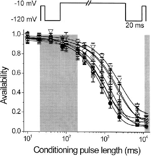 Figure 3. . The kinetics of entry to slow inactivation at −10 mV. The paired pulse protocol used to measure entry to slow inactivation is shown schematically at the top of the figure. The symbols used for each mutant are identical to those listed in the inset of Fig. 2 A. The majority of the mutations had no significant effect on the time course of entry to slow inactivation. E758C showed a modest 2.5-fold slowing in the time course of entry, and a modest decrease in the maximal extent of slow inactivation (S∞). The shaded areas represent the timing and duration of the MTS-ET exposures designed to assay cysteine availability for predominantly fast- and slow-inactivated conditions.