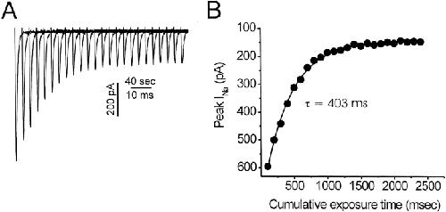 Figure 4. . Measurement of state-dependent modification rate. (A) Na currents elicited by the assay pulses during serial exposures to MTS-ET are shown on a condensed time scale. The top number of the time scale represents the interval elapsed between each assay pulse, and the bottom number represents the time scale relative to individual assay pulses. In this example, accessibility of the E758C residue is being tested by serial 200 ms exposures to 2 mM MTS-ET early during the conditioning pulse (minimally slow inactivated). (B) Peak INa values from A are plotted against the cumulative time of exposure to MTS-ET, and fit with a single exponential decay. The apparent modification rate (RApparent) is then computed from the time constant.