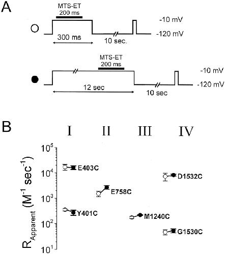 Figure 5. . No state-dependent change of cysteine modification rate was seen in the six mutants studied. (A) Schematic representation of the pulsed MTS-ET application protocols. Modification rates for fast-inactivated channels were assayed by exposing outside-out patches to MTS-ET for 200 ms, beginning 20 ms into the 300 ms conditioning pulse (top protocol, open circles). To measure the modification rate of slow-inactivated channels, patches were exposed to MTS-ET beginning 10.5 s after the onset of a 12 s conditioning pulse (bottom protocol, filled circles). All conditioning pulses were to −10 mV, and a gap of 10 s at −120 mV to allow for full recovery from inactivation was inserted before a test pulse to −20 mV to measure remaining peak INa. This cycle was repeated until maximal modification in each patch had taken place. (B) Comparison of modification rates of cysteines in each of the four domains measured under conditions in which channels were predominantly fast- or slow-inactivated. The mean and SEM of these rates are plotted by domain location for each mutant, with rates for the two states of the channel connected by a line. The numerical values are listed in Table II.