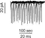 Figure 6. . Absence of detectable modification of I757C by MTS-ET. Na currents elicited after successive exposures to 4 mM MTS-ET are shown on a compressed time scale. MTS-ET was applied for 200 ms, beginning 20 ms after the onset of a conditioning pulse to −10 mV (fast-inactivation protocol). No reduction in peak INa was detectable, even after a cumulative exposure time of 8 s. Onset of each trace is offset by the time interval between each trial (scale bar, top). Time scale during a trace is indicated by the number below the scale bar.