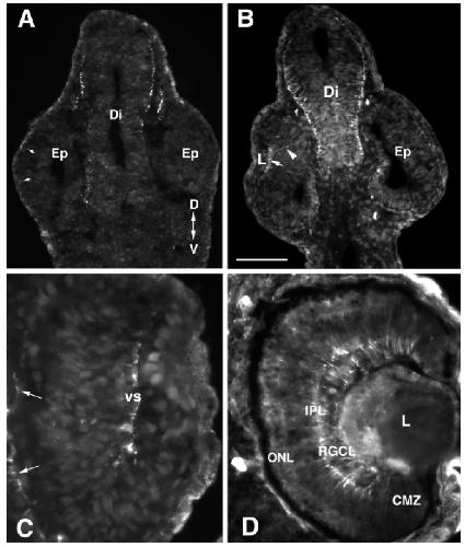 retina and brain are immunopositive. B: At stage 37/38, retinal ganglion