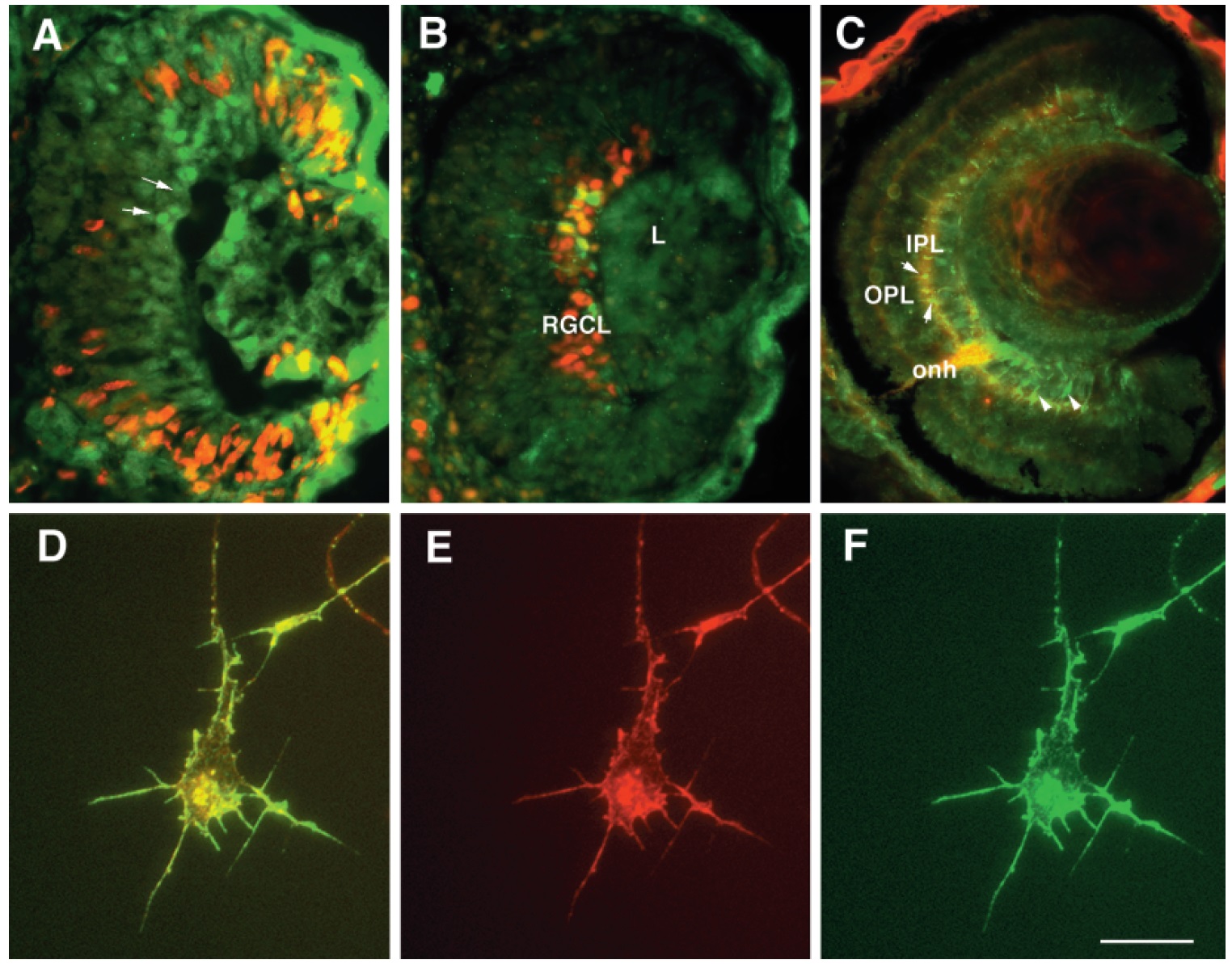 notably cells in the retinal ganglion cell layer (RGCL). C,D: Fluorescent