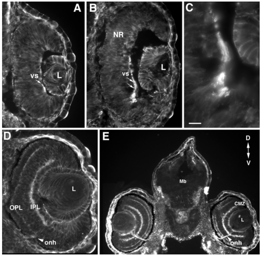 vitreal surface (vs). D: In a stage 37/38 retina, membrane-associated