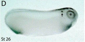 unc5b (unc-5 homolog B)gene expression in Xenopus laevis embryo, assayed via in situ hybridization, NF stage 29, lateral view, dorsal up,anteriorright.