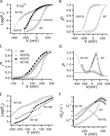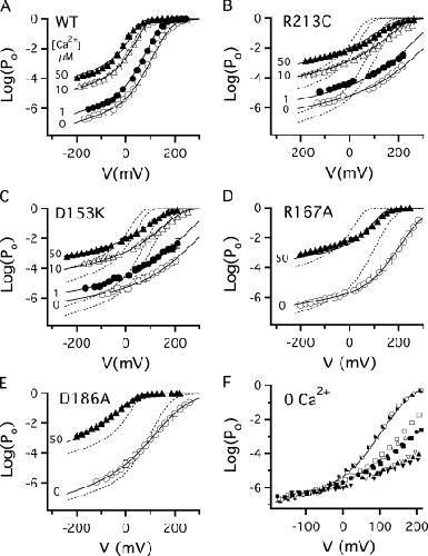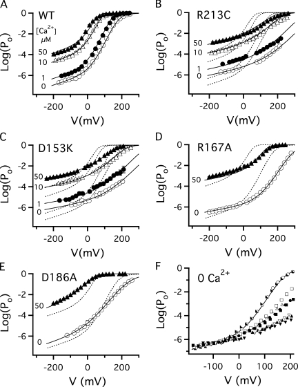 Figure 5. Effect of potential voltage-sensing residue mutations on PO. Mean log(PO)-V relations for (A) WT, (B) R213C, (C) D153K, (D) R167A, and (E) D186A in 0–50 μM Ca2+. Solid lines are the fits to the HA model (Table I parameters). Dashed lines represent the WT fit. (F) Log(PO)-V relations in 0 Ca2+ for WT (○), D153C(▵), D153K (▴), R213C (▿), R213E (▾), R167A (□), R167E (▪), D186A(•), and R113Q () are superimposed to show that mutations reduce voltage dependence at the foot of the curve, consistent with a change in gating charge. Mutant curves were shifted along both axes as described below to match the WT at −90 mV. According to analysis presented in the text, the qa-V relation can be approximated by QO (Eq. 5) at extreme negative voltages. Therefore ln(PO) can be approximated as the sum of a linear and exponential function: ln(PO) = [ln(L0/(1 + L0))+(zL/kT)V] + [4DJ0exp(zJV/kT)]. Curves were shifted along the voltage axis such that the exponential component of this equation for all curves equaled 0.1 log unit at −90 mV, representing the transition between a linear and nonlinear function (i.e., the foot of the curve). Thus, the voltage shift for mutants was ΔV = V0.1(WT) − V0.1(mutant) where V0.1= (kT/zJ)ln[0.1/(4DJ0log(e))], and the parameters zJ, D, and J0 were taken from Table I. |