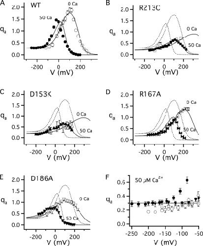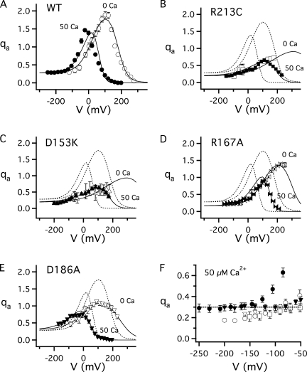 Figure 6. Effect of potential voltage-sensing residue mutations on qa. Mean qa-V relations for (A) WT, (B) R213C, (C) D153K, (D) R167A, and (E) D186A in 0 Ca2+ and 50 μM Ca2+. Solid lines are the fits to the HA model (Table I parameters). Dashed lines represent the WT fit. (F) Foot of the qa-V relations in 50 Ca2+ for WT (•), Y163E (▾), R213C (□), D153K(○), and R167A (▿) are superimposed to show that the limiting value of qa (i.e., zL) is reduced by voltage sensor mutation. Dashed line represents zL for the WT (0.30 e). |