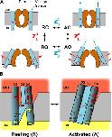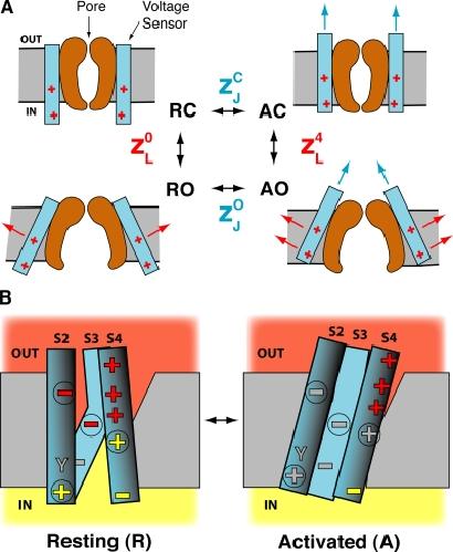 Figure 11. Mechanisms of voltage sensor activation. (A) Cartoon illustrates how voltage sensors may contribute to the gating charge associated with channel opening (zL). The pore and voltage sensor domains for two subunits in a channel are depicted in different combinations of O/C and R/A states respectively. When all voltage sensors are in the resting state, channel opening (RC to RO) displaces peripherally associated voltage sensors through the membrane electric field, thereby moving gating charge (red arrow, ). (B) Transporter-type mechanism of voltage sensor activation illustrates how positively and negatively charged voltages sensing residues in S2, S3, and S4 may both contribute to gating charge in mSlo1. All charged residues in S2–S4 are shown. Mutation of potential voltage-sensing residues (circled) reduce gating charge, implying that positive and negative charges must move in opposite directions through the electric field during activation. In the resting state, these positive and negative charges are shown as exposed to the internal (yellow) and external (red) solutions, through aqueous crevices, and therefore lie outside of the electric field. Upon activation, the packing of S2–S4 segments is altered such that charges are buried in the electric field, effectively moving positive charges outward and negative charge inward. Colors indicate the exposure of each residues (red, out; yellow, in; gray, buried). Non–voltage-sensing residues and positions (Y163) are shown as remaining in a constant environment. |