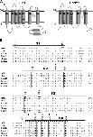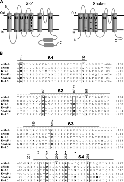 Figure 1. Charged residues in the transmembrane segments of BK and KV channels. (A) The membrane topology of Slo1 and Shaker potassium channel subunits. Both contain a core domain including S1–S4 voltage sensor and S5–S6 pore. Slo1 contains an additional NH2-terminal transmembrane segment (S0) and large COOH-terminal tail. Conserved basic (+) and acidic (−) amino acids in the S1–S4 segments are indicated. (B) Multiple sequence alignment of voltage sensor domain from mouse and Drosophila homologues of Slo1 (mSlo1, dSlo1) and KV channels (KVAP2.1, KVAP, Shaker, KV1.2) based on Jiang et al. (2003). Putative transmembrane segments are denoted by solid lines based on hydropathy analysis of Slo1 (Wallner et al., 1996) and dashed lines based on the structure of KVAP (Jiang et al., 2003). Charged residues that are highly conserved in Slo1 or in KV channels are bold. Positions that were mutated in mSlo1 are numbered and indicated by boxes. Potential voltage-sensing residues in Shaker are indicated by stars, with double stars indicating those where mutation has the greatest impact on gating charge (Aggarwal and MacKinnon, 1996; Seoh et al., 1996). |