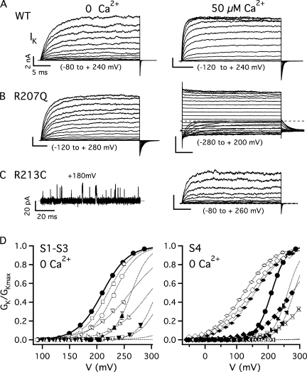 Figure 2. Mutation of charged residues in voltage sensor domain alter mSlo1 gating. Families of IK evoked from (A) WT (B) R207Q, and (C) R213C channels in response to pulses to different voltages at 20-mV intervals from a holding potential of −80 mV. Currents in 0 Ca2+ and 50 μM Ca2+ for each channel were recorded from the same patch. Dashed lines indicate the zero current level. (D) GK-V relations (mean ± SEM) for WT and mutant channels are normalized by GKmax determined in 50 μM Ca2+ and are fit by Boltzmann functions (lines). WT (•), R113Q (○), D133Q (□), D153K (▪), D153C (▵), Y163E (▴), R167E (▿), R167A (▾), E180A (), D186A (), R201Q (), R207E (), R207Q (), R210C (), R210E (), R210N (), R213C (), R213E (), E219Q (). |