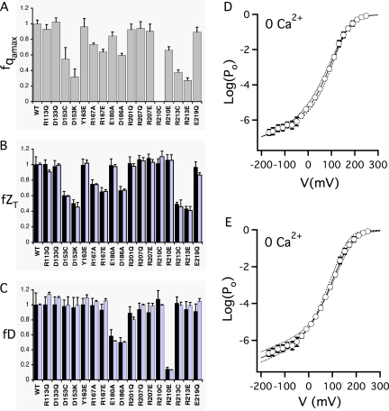Figure 4. Effects of voltage sensor mutations on gating charge and allosteric coupling. (A) qaMAX for each voltage sensor mutant was determined from the mean PO-V relation in 0 Ca2+ (see MATERIALS AND METHODS) and normalized to that of the WT (1.89 e). qaMAX for R210C could not be determined for reasons discussed in the text. (B) The total gating charge (zT = zL + 4zJ) and (C) allosteric coupling factor D were estimated from fits of PO-V and qa-V relations to the allosteric models and normalized to those for the WT (zT = 2.62 e, D = 23.9). Shaded bars were determined by semi-automated fitting of the HCA model to 0 Ca2+ data (see MATERIALS AND METHODS). Solid bars represent fits to data in all [Ca2+] using the HA model (Table I) with parameters adjusted manually. (D and E) Confidence limits for manual fits were estimated for zT or D by adjusting zJ (panel D) or D (panel E) respectively from the best fit values (solid line) to exceed the error range of PO as indicated by dashed lines. |