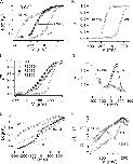 Figure 3. Data analysis and modeling. (A) Po-V relation for WT mSlo1 channels in 0 Ca2+ (mean ± SEM) is plotted on a semilog scale and fit by the HCA model (solid line, see be-low). The limiting slope at negative voltages is indicated by a dashed line representing the partial charge associated with channel opening (zL = 0.3 e). (B) qa-V relation determined from the logarithmic slope of mean PO (see MATERIALS AND METHODS). (C) HCA gating mechanism asserts that equilibration of the channel gate between closed and open (C–O) is influenced allosterically by four independent and identical voltage sensors that each can be in a resting or activated state (R–A). The equilibrium constants for channel opening L and voltage sensor activation J are voltage dependent with partial charges zL and zJ, respectively (). The activation of each voltage sensor increases the C–O equilibrium constant by an allosteric coupling factor D. (D) Gating scheme shows the closed and open states (Ci, Oi, where i = number of activated voltage sensors) and equilibrium constants specified by the HCA mechanism. Horizontal transitions represent voltage sensor activation, and vertical transitions represent channel opening. Solid lines in A and B represent best fits to the HCA model (zJ = 0.59 e, zL = 0.3 e, J0 = 0.017, Lo = 1.4 × 10−6, D = 23.1) determined by a semi-automated method (see MATERIALS AND METHODS). Dashed lines in B indicate the charge distribution for open channels (QO, Eq. 5) and the difference between charge distributions for open and closed channels Qo − Qc, Eq. 6), defined by the fit parameters. (E–H) Predicted effects of changing various parameters in the HCA model. (E) Changes in peak qa, expressed as a fraction of the control value (fqaMAX), produced by changing gating charge (zJ, zL) are directly proportional to the fractional change in total gating charge (fzT, where zT = zL + 4zJ). Dashed line indicates unity slope (b = 1). Solid lines indicate effects of proportional changes in both zL and zJ (b = 0.99) or changing zJ alone (b = 0.94). (F) Effects on fqaMAX of fractional changes in L0, J0, or D. (G) Effects on PO-V relation of changing zJ(0.35 e), D(5.1), J0(1.7), or L0(1.4 × 10−4) and leaving other parameters the same as the WT (solid line). (H) The decreases in zJ or D both decrease qaMAX relative to the WT (solid line) but have distinct effects on the qa-V relations. In particular, the steepness of the foot of the curve is reduced together with zJ but is not altered by changing D. |