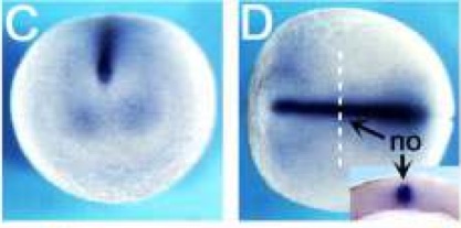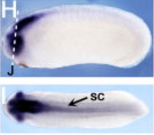 mig30 ( mig30) gene expression in Xenopus laevis embryo, assayed via in situ hybridization, NF stage 17, anterior view, dorsal up (E) and dorsal view, anterior right (G). |