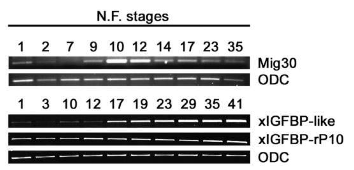 Fig. 2. Expression of Mig30, xIGFBP-like, and xIGFBP-rP10 during early Xenopus laevis embryogenesis determined by reverse transcription-