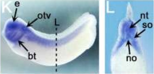 mig30 (mig30) gene expression in Xenopus laevis embryo, assayed via in situ hybridization, NF stage 28, lateral view, anterior left, dorsal up (K), and a transverse section through trunk section, dorsal up (L).