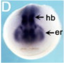mig30 (mig30) gene expression in Xenopus laevis embryo, assayed via in situ hybridization, NF stage 8.5, saggital section, anterior up.
