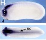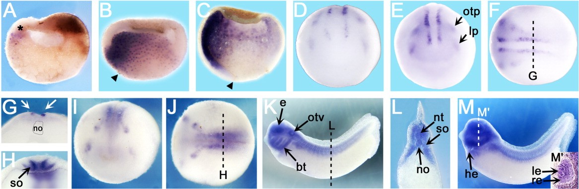 Figure 3. In situ hybridization of Mig30. Positions of sections are indicated by dotted lines, and letters mark corresponding panels. A-C: Sagittal sections; dorsal to the left. A: Stage (st.) 8.5; asterisk marks the blastocoele chordin- and noggin-expressing center. B,C: Black arrowheads mark the dorsal lip. B: St. 10.25. C: St. 11.5. D: St. 14; anterior view. E-G: St. 17. E: Anterior view. F: Dorsal view, anterior to the left. G,H: Transverse sections. I,J: St. 20. I: Anterior view. J: Dorsal view, anterior to the left. K,L: St. 31. K: Lateral view. L: Transverse section. M,M prime : St. 39. M: Lateral view. M prime : Transverse section. bt, branchial tissue; e, eye; he, heart; le, lens; lp, prospective lens placode; no, notochord; nt, neural tube; otp, prospective otic placode; otv, otic vesicle; re, retina; so, somite. |
