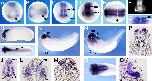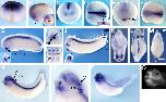 Figure 4. In situ hybridization of xIGFBP-rP10. Positions of sections are indicated by white dotted lines and letters mark corresponding panels. A,B: Sagittal sections. A: Stage (st.) 4. B: St. 10.5; black arrowheads mark dorsal lip; insert: vegetal view. C,D: St. 15. C: Anterior view. D: Dorsal view, anterior to the left; insert: transverse section. E,F: St. 21. E: Anterior view. F: Dorsal view, anterior to the left. G-I: St. 24. G: Lateral view; insert: vegetal view of head. H: Transverse section. I: Crude horizontal section at the level of the notochord. J-M: St. 30. J: Lateral view; insert: vegetal view of head. K-M: Transverse sections. N,O: St. 35; lateral view. O: Magnification of head region. P,Q: St. 40; lateral view. O: Magnification of head region; reversed saturation image of P, to visualize pattern of strongly stained areas. cg, cement gland; cnh, chordoneural hinge; df, dorsal fin; fp, floor plate; hm, head mesenchyme; no, notochord; otv, otic vesicle; so, somite; vf, ventral fin; VII and IX/X, cranial ganglia. |