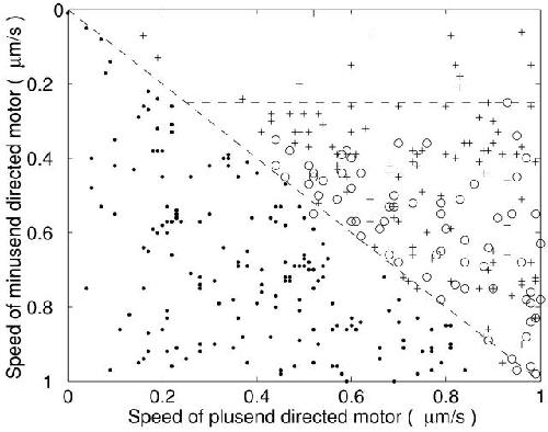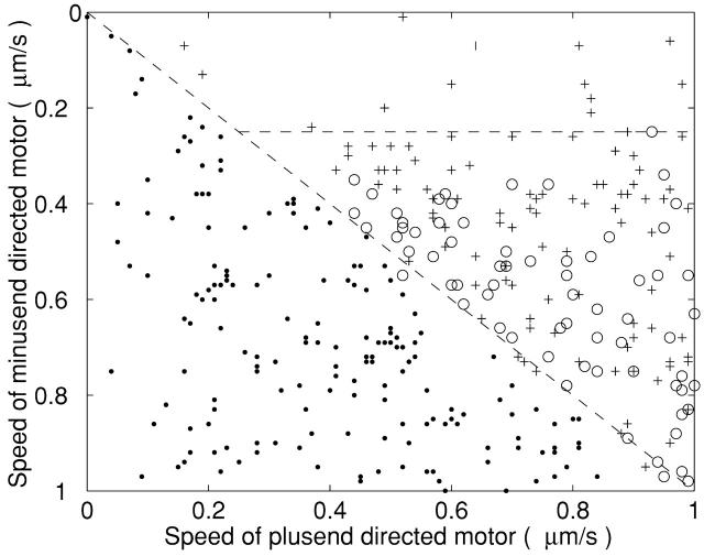 Figure 6. Probing the constraints on the speeds. Each symbol represents one simulation and is plotted here as a function of the unloaded speeds (Vmax) of the two motors in the complex. Dots, S1 produced in screen 3a; circles, S2 produced in screen 3b, in which the motor could stay attached only to growing microtubules; pluses, S2 produced in screen 3c when the motor could stay attached also to shrinking ends.