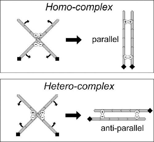 Figure 7. The zipper effect. Schematically, the action of homocomplexes on two microtubules produces parallel microtubule overlap, whereas heterocomplexes produce antiparallel overlaps.