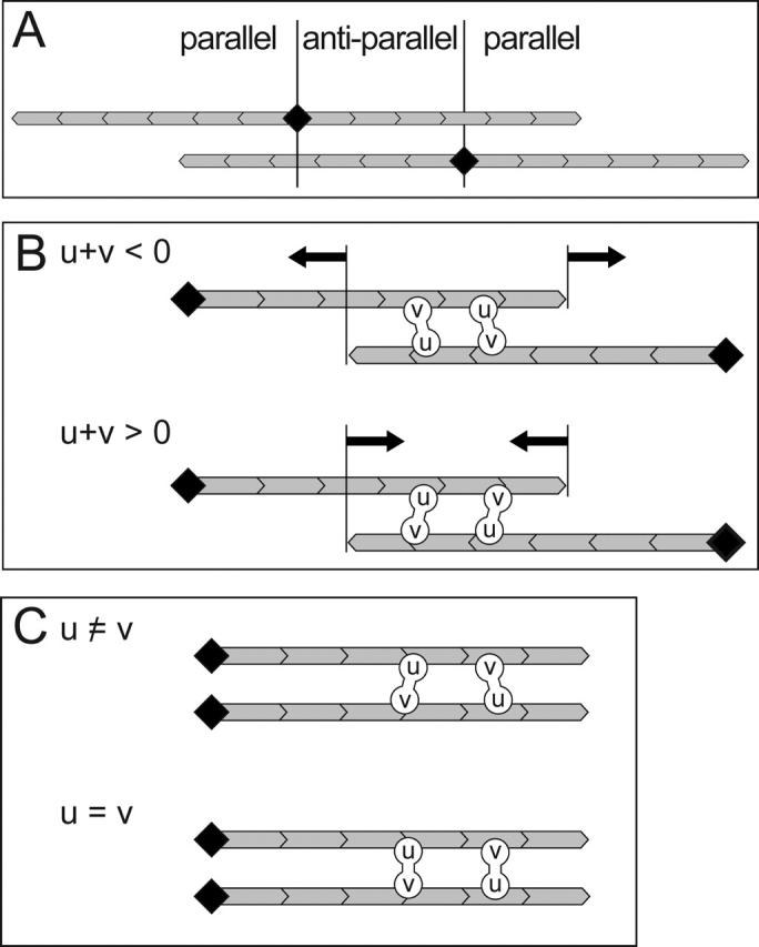 Figure 4. Symmetry arguments. (A) Two asters can have antiparallel overlaps, but also parallel ones, when they are close. (B) On an antiparallel overlap, heterocomplexes of speeds u and v produce attractive force if u + v < 0, or repulsive force if u + v > 0. Both possible motor configurations produce forces in the same direction. (C) On a parallel overlap, if u ≠ v, the two configurations result in opposite forces. If they are equally probable, these forces cancel each other. A homocomplex (u = v) does not produce any force on parallel microtubules and stabilizes the overlap.