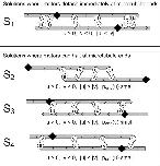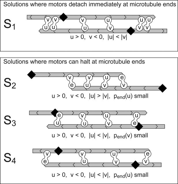 Figure 3. The balance of forces in the solutions. Schematic asters in 1D only have two opposing microtubules radiating from a common center represented by a black diamond. All solutions are built from one kind of heterocomplex with two speeds u and v, which must satisfy the conditions specified here. Solution S1 is found even when motors immediately detach from the end of the microtubules, whereas the others are obtained when the motors can stay at the end (in this situation, u or v is replaced by e). Pushing or pulling is schematically represented here by the tilt of the complex, which is a consequence of the relative movement of both motors. The attractive or repulsive nature of the forces can be deducted by mentally trying to restore the complexes in a vertical position.