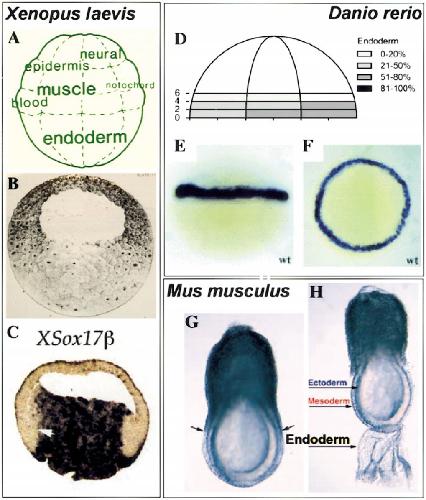 (bottom). Data are also shown for mRNA in situ hybridization for endodermal markers, Xsox17 (C) in Xenopus (Zorn et al., 1999b) and