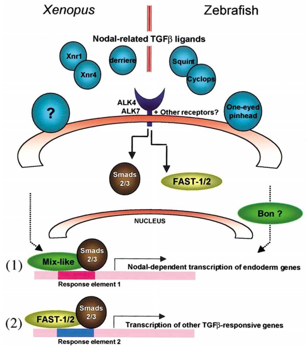 proteins (One-eyed pinhead in zebrafish, ? in Xenopus). These interactions activate latent transcriptional regulators, Smads, and FAST