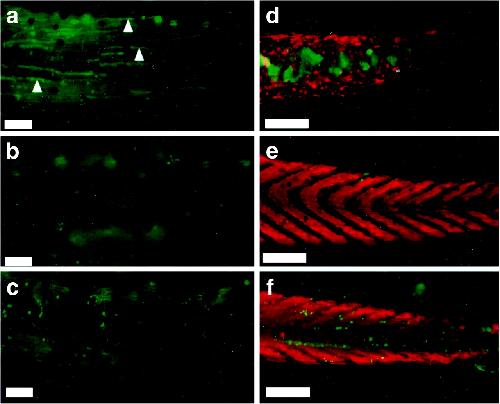 Fig 3. Caspase-3 activity in the tadpole tails in the 2-wk assay and retention of muscle in tail tip. (a) Tail from a wild-type animal treated with 10 nM T3 for 4 days. Note the caspase-3-positive muscle fibers (examples are shown with arrowheads). (b) Tail from an untreated control animal. (c) Tail from a pCar/TRDNα-expressing animal treated with 10 nM T3 for 4 days. Note the caspase-3-positive epidermal cells similar to a but the lack of caspase-positive muscle fibers. (dâf) Tips of the tail stained with MF20 (red) and anti-active caspase-3 antibody (green) of 10 nM T3-treated (7 days) wild-type, untreated wild-type, and 10 nM T3-treated (7 days) pCar/TRDNα tadpoles, respectively. [Bars = 100 μm (aâc) and 200 μm (dâf).]